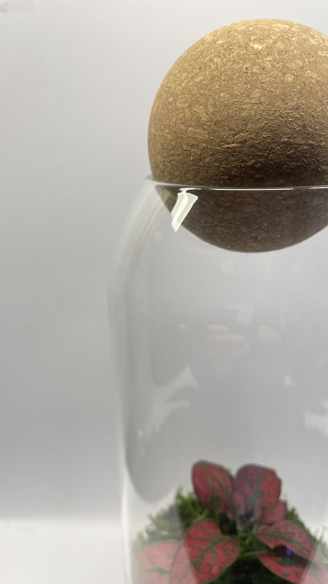 Fermée par une élégante sphère en liège, elle crée un équilibre naturel où l’humidité et la vie circulent en continu, sans besoin d’arrosage.