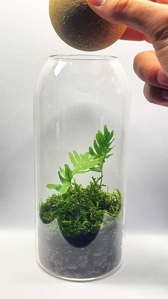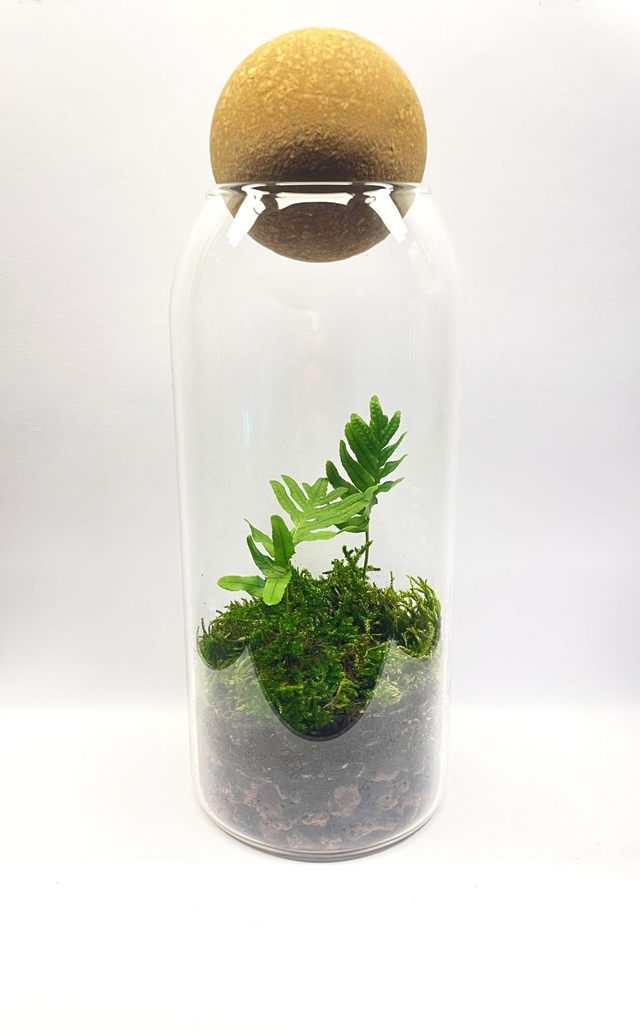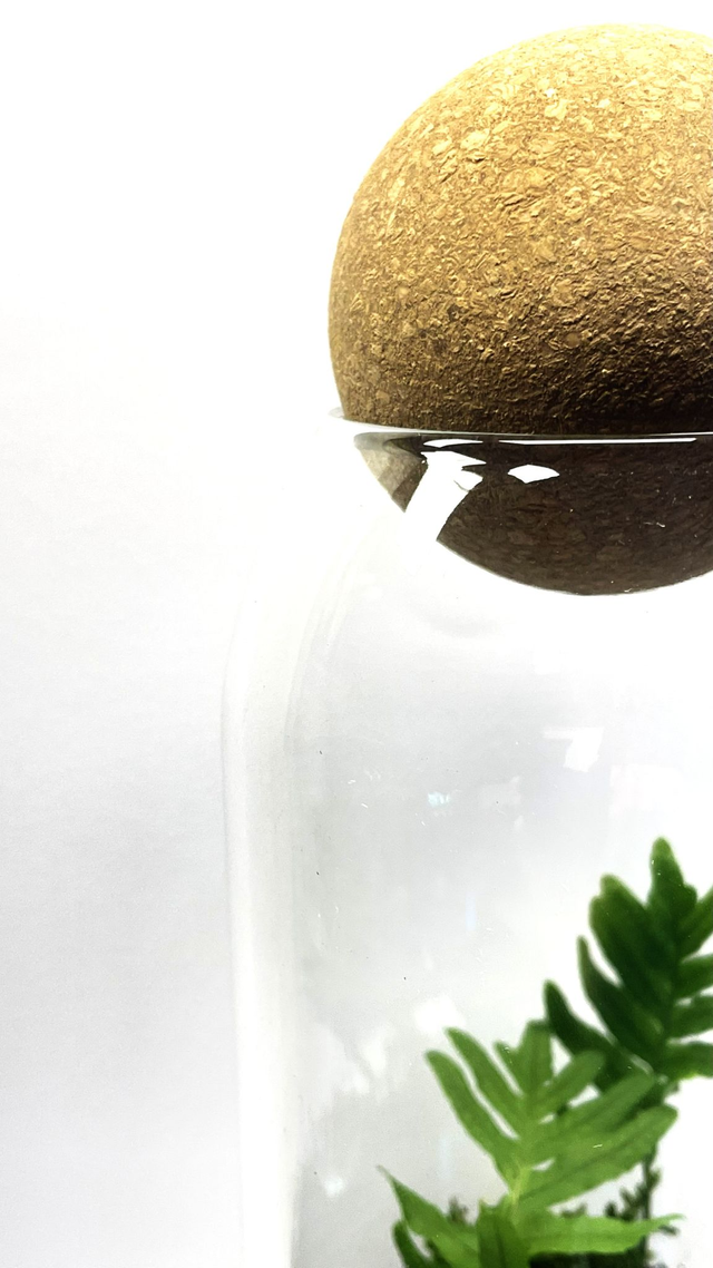 Fermée par une élégante sphère en liège, elle crée un équilibre naturel où l’humidité et la vie circulent en continu, sans besoin d’arrosage.