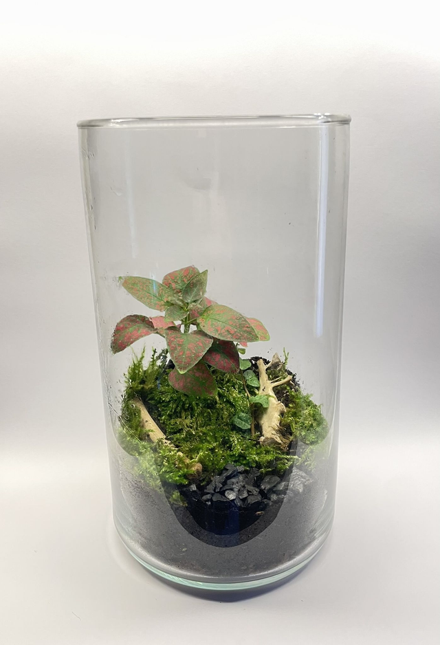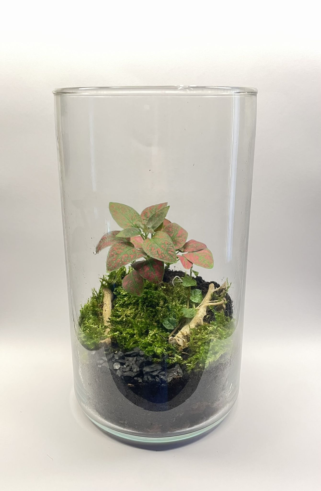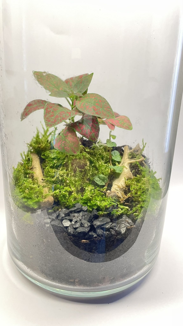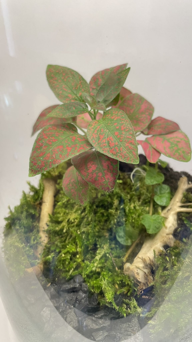 Elle contient une fougère polypode ou fittonia red s’épanouissant sur un tapis de mousse humide, créant un environnement à la fois vivant et apaisant.