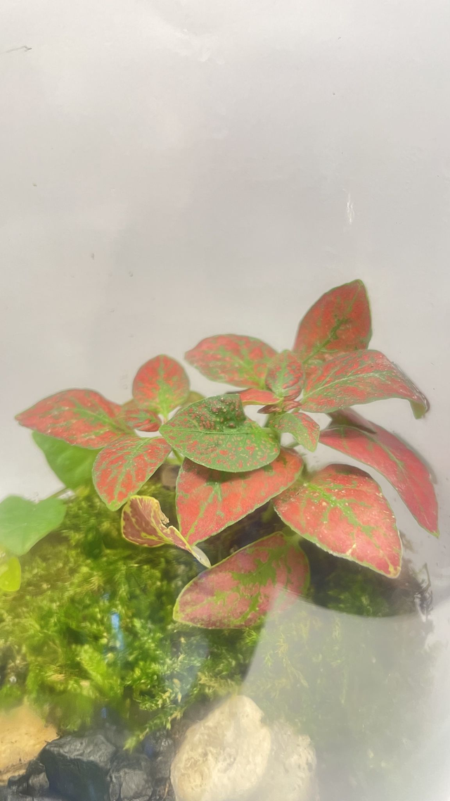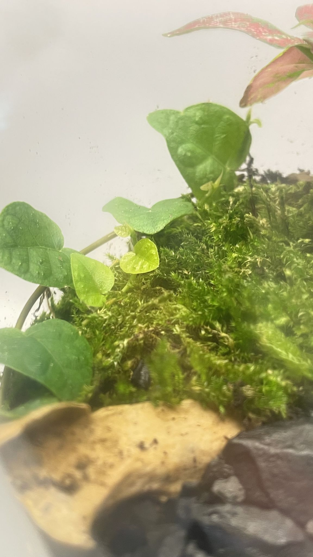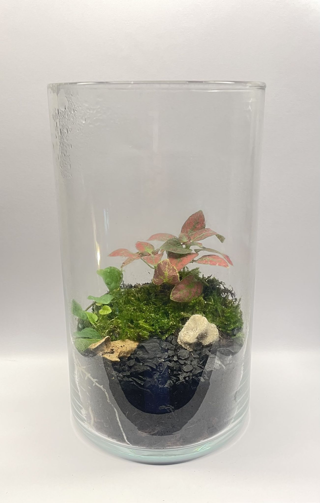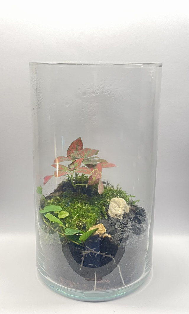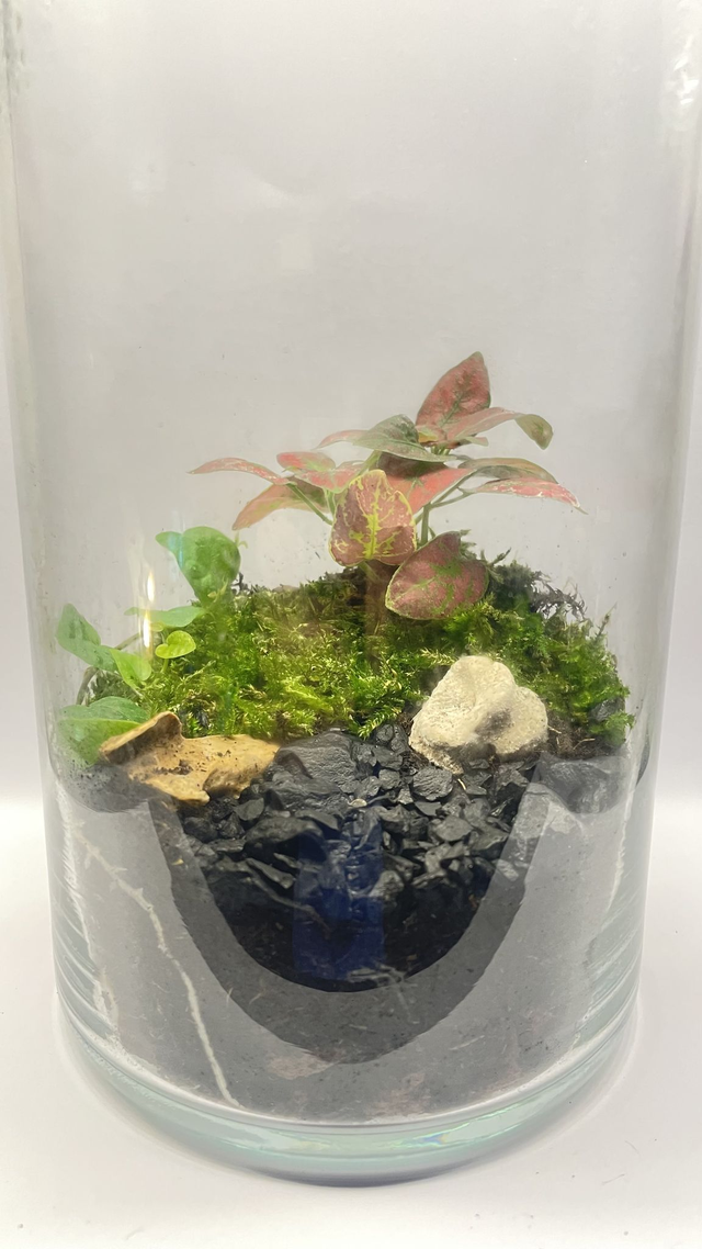 Elle contient une fittonia red et un ficus pumila s’épanouissant sur un tapis de mousse humide, créant un environnement à la fois vivant et apaisant.