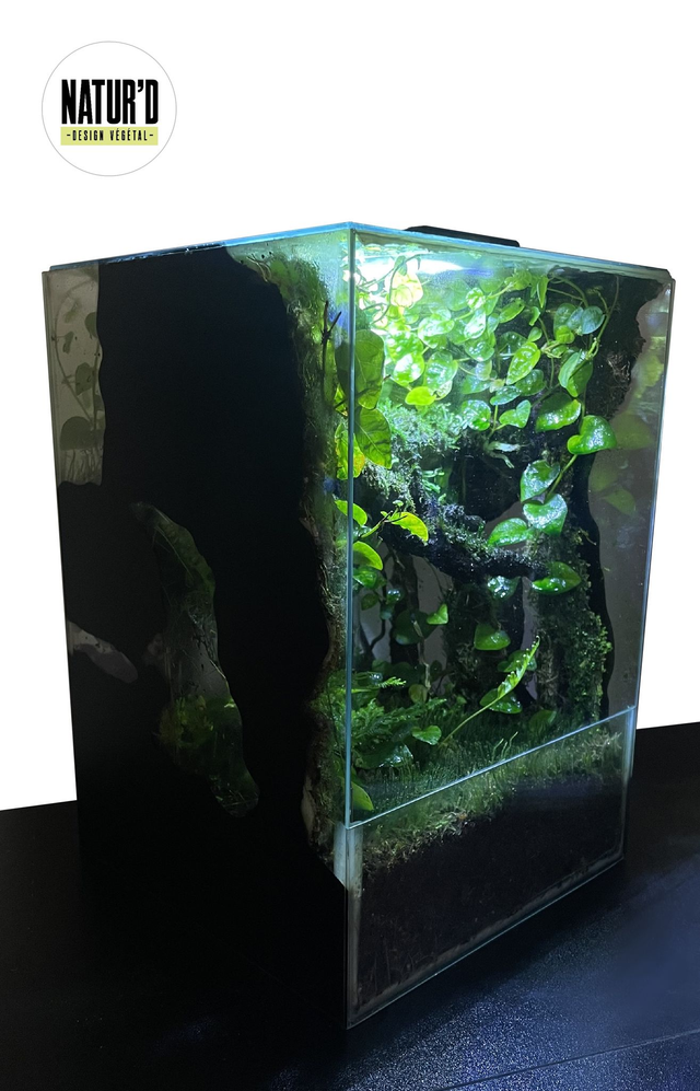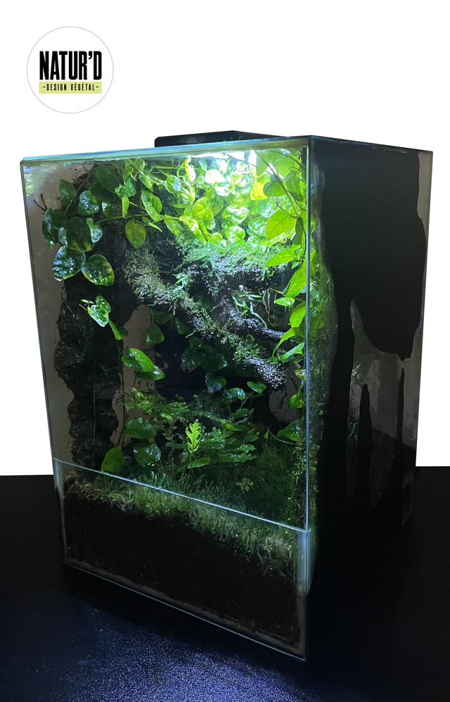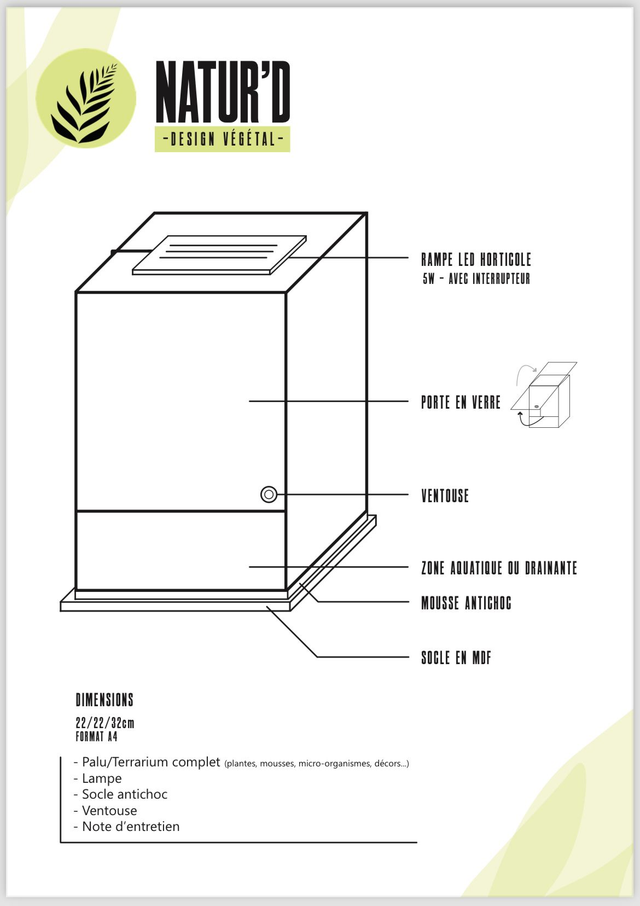 Le terrarium est vendu entièrement assemblé avec son écosystème stabilisé, son socle antichoc, et sa lampe horticole, afin que vous n’ayez rien à faire une fois chez vous.